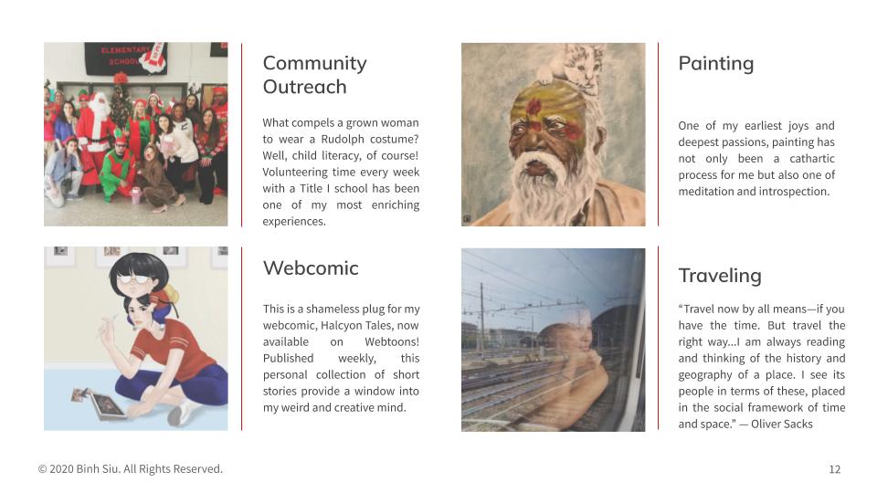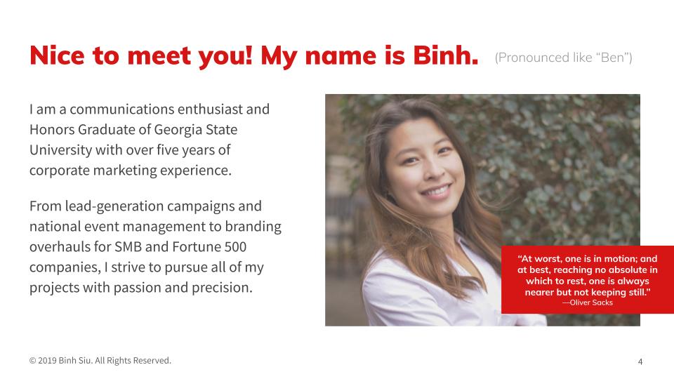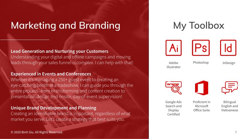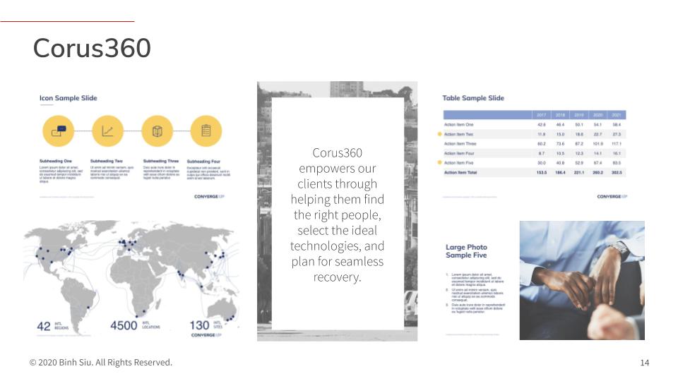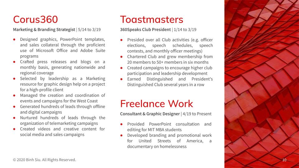 PowerPoint presentation templates built from scratch to better represent your brand during those crucial meetings. Below is a sample template I built that expounds on my resume.